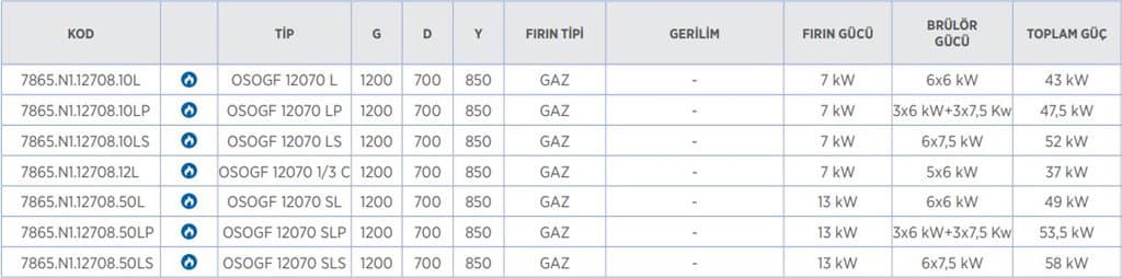 Üst ocaklar 4 brülörlüdür. Fırın bölümü opsiyonel olarak elektrikli statik fırın veya gazlı statik fırın olarak tercih edilebilir. Gazlı fırınlarda piezzo çakmaklı ateşleme mevcuttur.