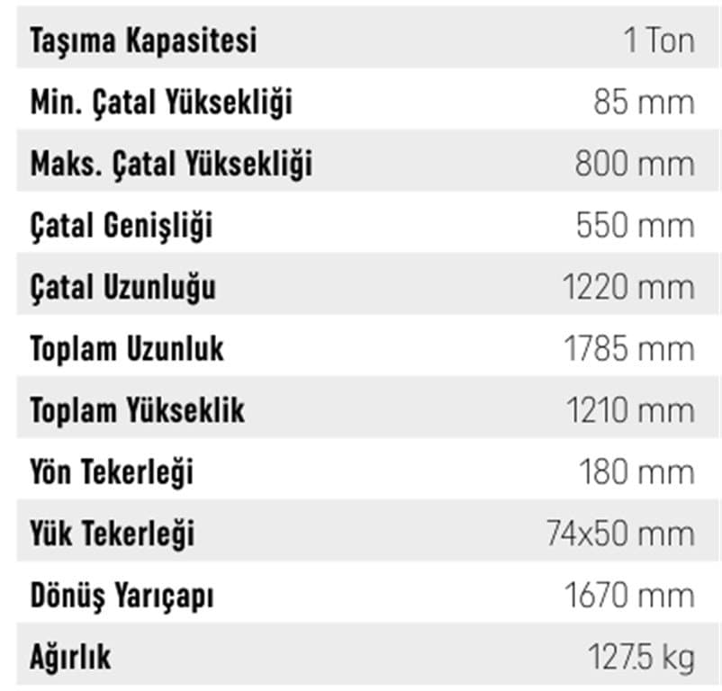 Max. Çatal Yüksekliği (mm)800 (mm)