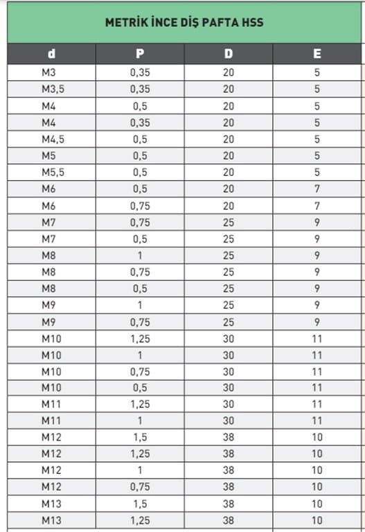 Ana Özellikler HSS, Metrik İnce Diş Pafta