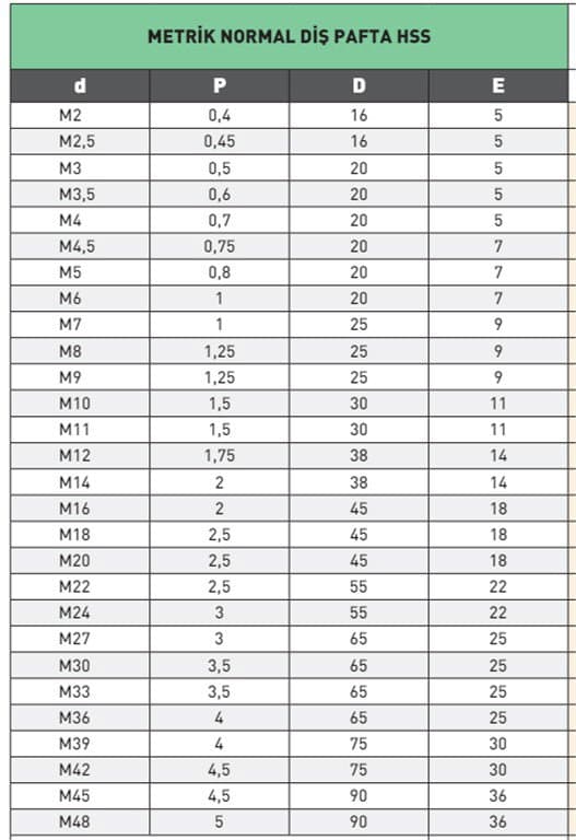 Ana Özellikler HSS, Metrik Diş Pafta